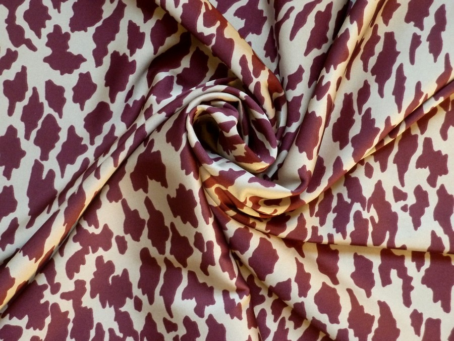 Tato béžová hedvábná šatovka má vínový abstraktní vzor. Vínový potisk připomínající mořskou hladinu působí velmi moderně a energicky. Látka je splývavá a příjemná na nošení. Je  vhodná na šaty, sukně, košile, halenky apod. lze kombinovat s jednobarevným materiálem ART 8240.