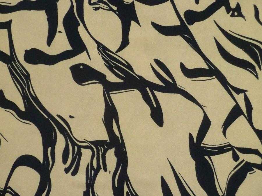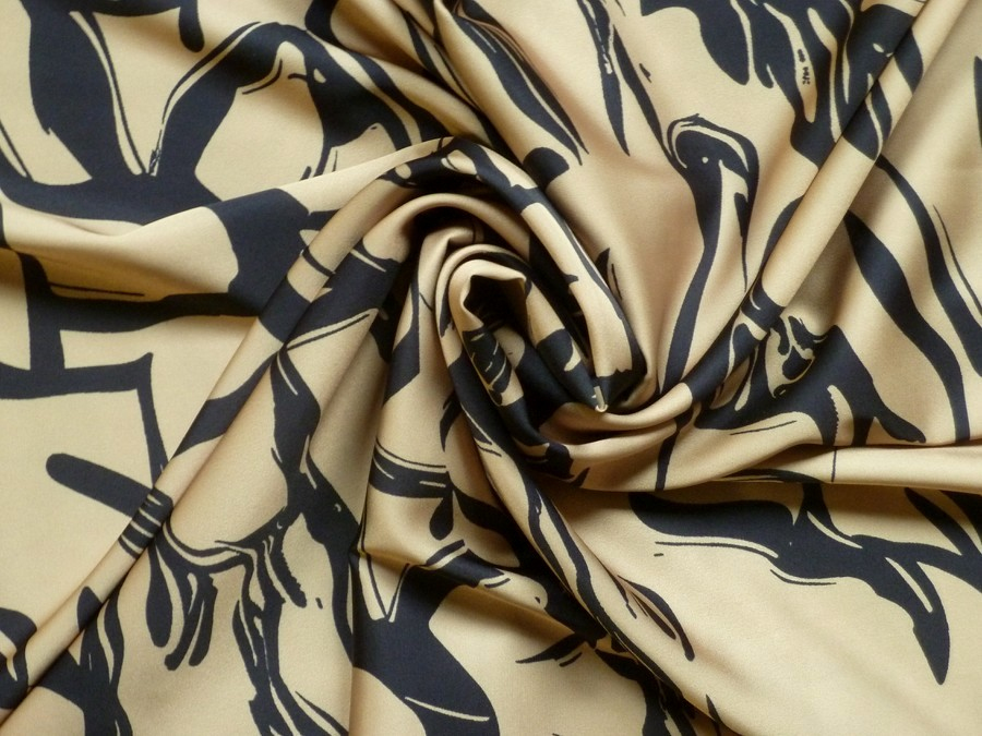 Toto béžové acetátového hedvábí tvoří osvěžující odstín, na kterém jsou vykresleny černé organické linie.