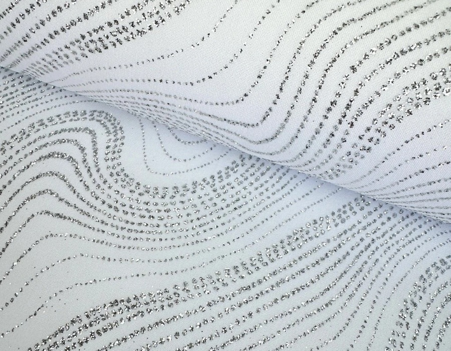 Tato jedinečná bílá společenská látka je navržena tak, aby přitahovala pozornost pod světly tanečního parketu. Lehká a prodyšná textura nabízí pohodlí a svobodu pohybu, což je nezbytné pro protančení celé noci bez obětování stylu. Aplikace třpytek dodává nádech magie a vytváří jiskřivý efekt, který umocňuje půvab každého tanečního pohybu. Ideální pro výrobu tanečních kostýmů a šatů.
