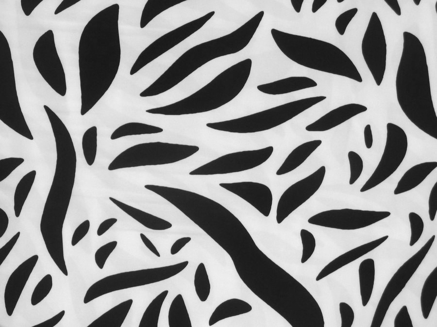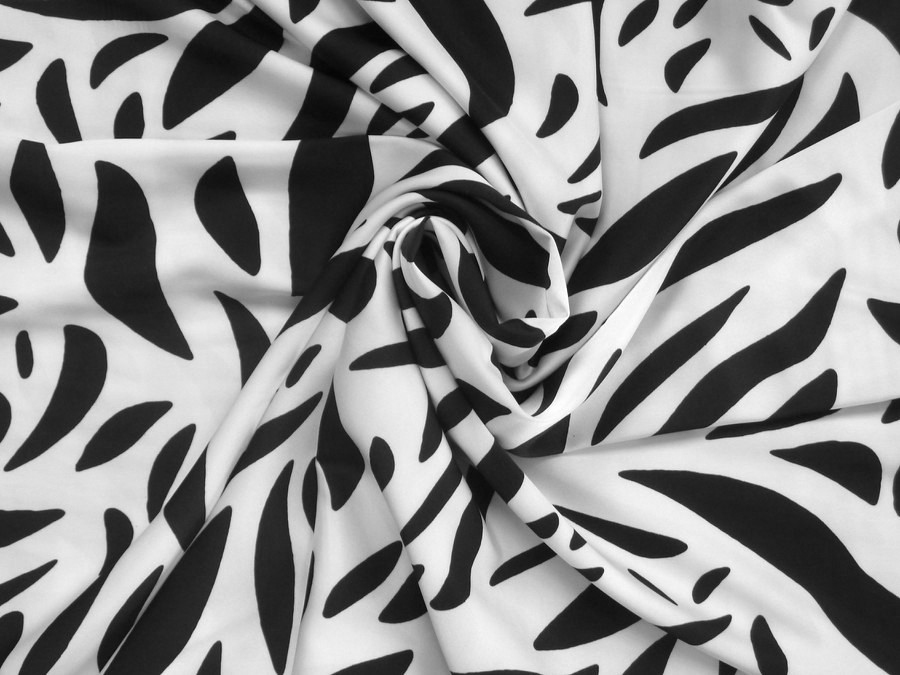 Tato bílá hedvábná šatovka má černý vzor s listy. Barevná kombinace dodává látce luxusní a nadčasový vzhled. Je splývavá a příjemná na nošení. Je  vhodná na šaty, sukně, košile, halenky apod. lze kombinovat s jednobarevným materiálem ART 8240.