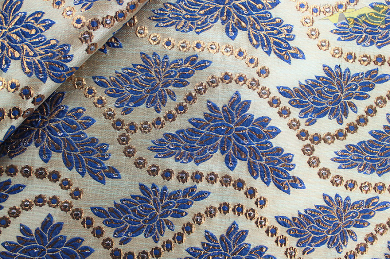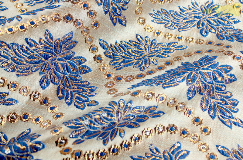 Pestrobarevný brokát s modrým květinovým motivem. Je vhodný pro tvorbu karnevalových kostýmů a dekorací, ale také pro scénografické ukázky všeho druhu.