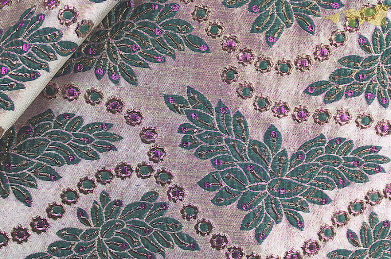 Pestrobarevný brokát se zeleným květinovým motivem. Je vhodný pro tvorbu karnevalových kostýmů a dekorací, ale také pro scénografické ukázky všeho druhu.