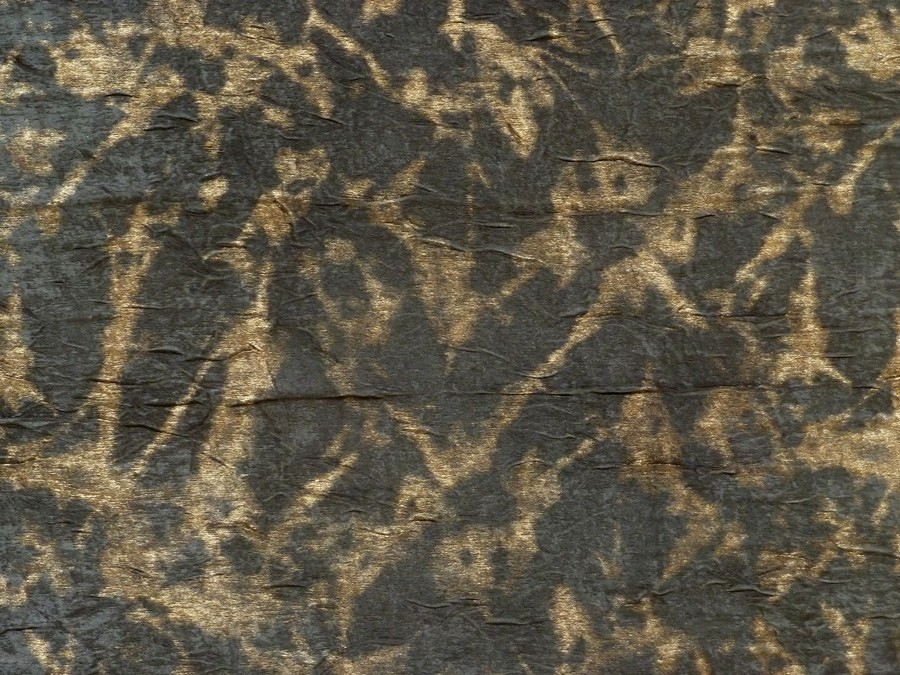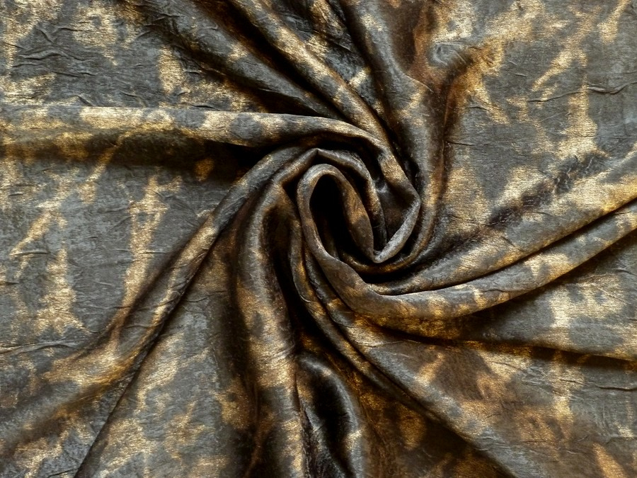 Černá Seersucker látka se zlatým abstraktním vzorem. Díky svému dramatickému vzhledu a luxusnímu dojmu je tato látka ideální pro večerní a slavnostní oblečení.