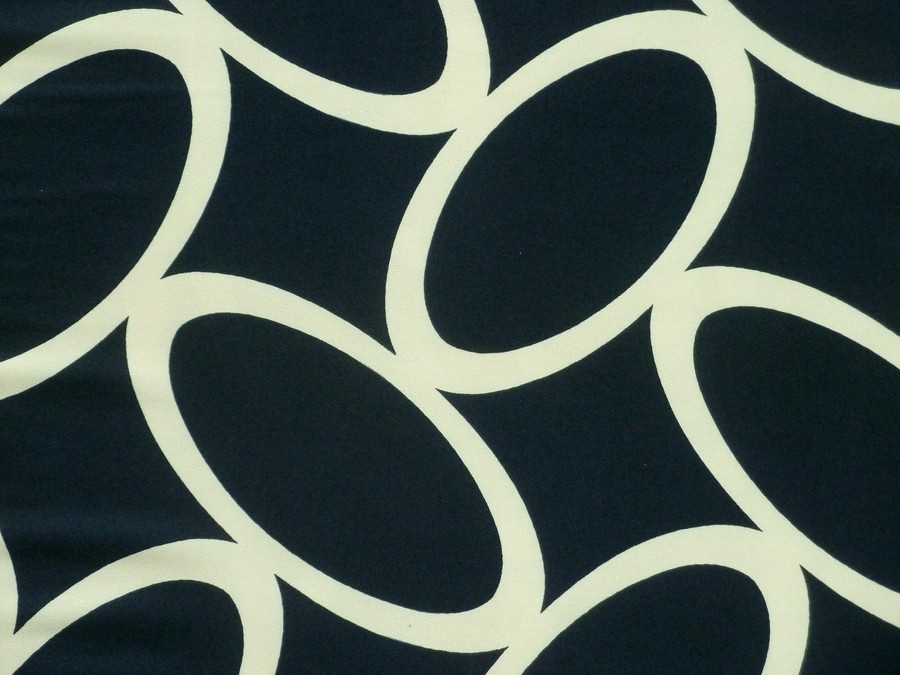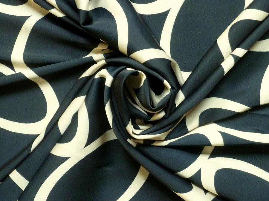 Toto černé acetátové hedvábí má dominantní vzor velkých, propojených oválů na hlubokém černém podkladu. Tento grafický motiv vytváří moderní, téměř architektonický dojem. Materiál je krásně splývavý, což z něj dělá perfektní volbu pro modely, které mají kopírovat siluetu nebo vytvářet elegantní záhyby. Možno použít na elegantní halenky, šaty (pouzdrové i zavinovací), sukně nebo luxusní pyžama.