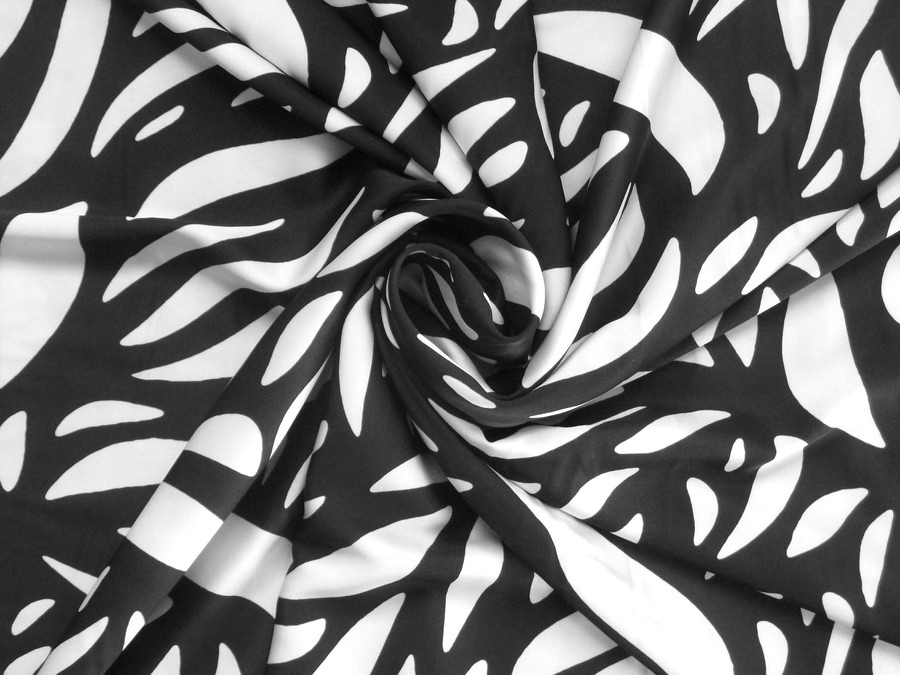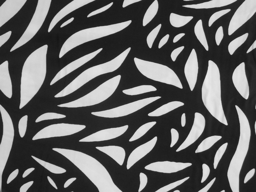 Tato černá hedvábná šatovka má bílý vzor s listy. Barevná kombinace dodává látce luxusní a nadčasový vzhled. Je splývavá a příjemná na nošení. Je vhodná na šaty, sukně, košile, halenky apod. lze kombinovat s jednobarevným materiálem ART 8240.