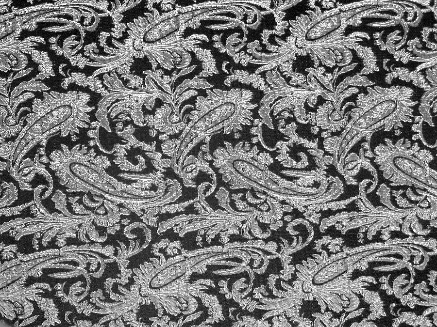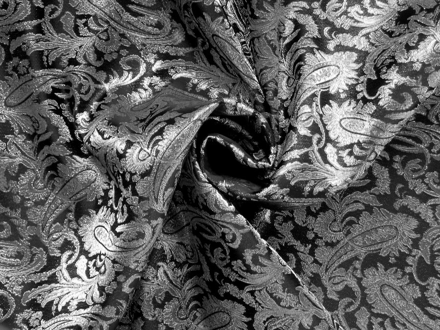 Černý brokát se stříbrnou žakárovou výšivkou. Kvalitní brokát s ornamentálním vzorem, který dodá vašemu outfitu nebo interiéru nádech luxusu. Brokát je vhodný pro šití slavnostních oděvů, jako jsou kabáty, vesty, sukně, šaty, divadelní kostýmy, ale také bytových doplňků, jako jsou polštáře, závěsy nebo ubrusy.