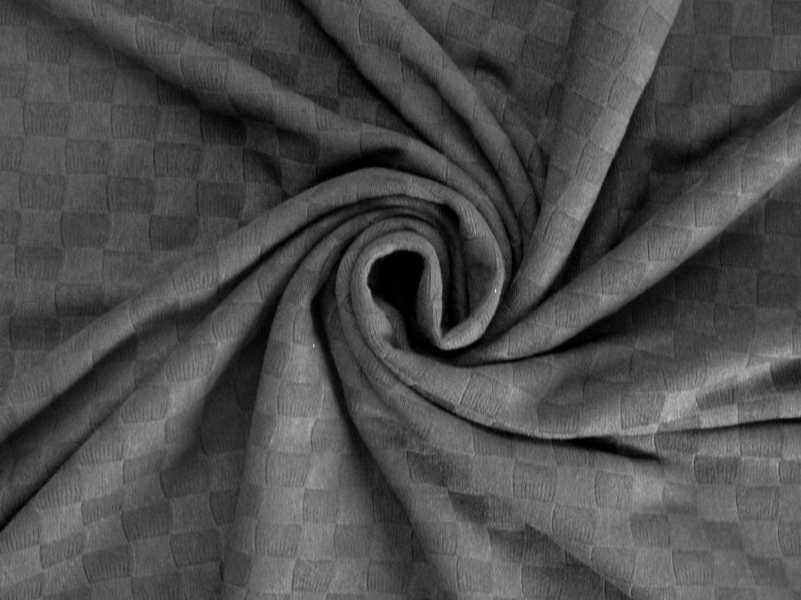 Černý žakárový úplet se čtverečkovým plastickým vzorem. Přítomnost angory dodává pletenině luxusní jemnost, lehkost, výjimečnou hřejivost a mírný chmýří/vlas, který je pro tento typ vlákna typický. Ideální pro šití zimních a podzimních oděvů, jako jsou úpletové šaty, cardigany, pulovry nebo vesty, kde je požadována hřejivost, bohatá textura a elegantní vzhled.