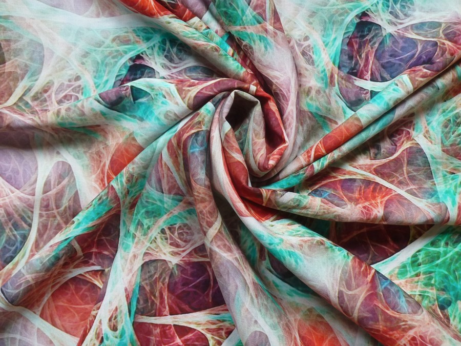 Tato viskozová látka není jen obyčejný potisk, je to umělecké dílo. Díky pokročilé technologii 5D tisku získává vzor neuvěřitelnou hloubku a plasticitu. Design připomíná organické struktury, propletená nervová vlákna nebo snovou ledovou krajinu v kombinaci s ohnivými akcenty. Vzhledem k výraznému vzoru z ní budou vypadat fantasticky zavinovací šaty - vzor se bude krásně lámat v záhybech, maxi sukně - nechte vyniknout plochu tisku při každém kroku, vzdušné tuniky a halenky - skvěle doplní jednobarevné kalhoty, nebo luxusní pyžamové sety.