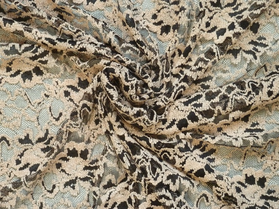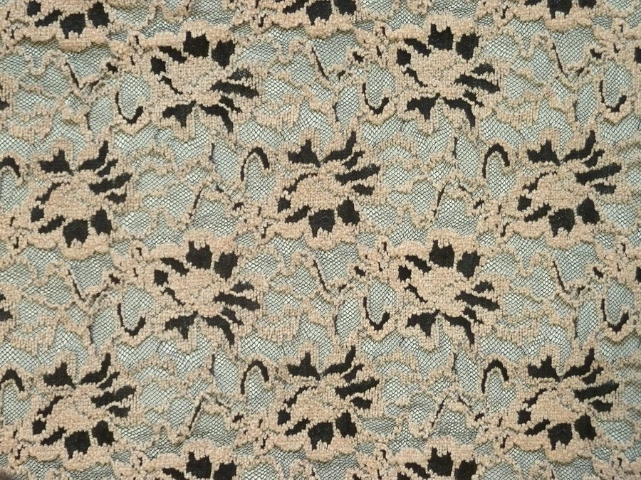 tato elastická krajka béžová má vytkávaný květinový vzor. podkladový materiál je černý. při použití na šaty a sukně je nutné podšití materiálu. je vhodná na šaty, sukně, halenky, topy apod.