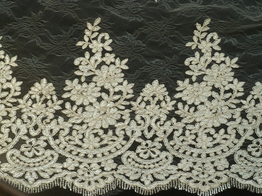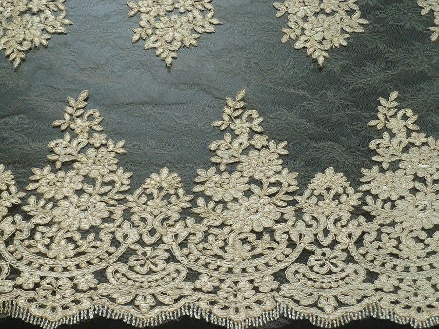 tato luxusní krajka písková z italské kolekce má oboustranné ozdobné zakončení. je vyšívaná na tylu. je nutné podšití materiálu. při využití bordury je nutné stříhat po šíři. je vhodná na svatební šaty, společenské šaty, sukně, halenky apod.