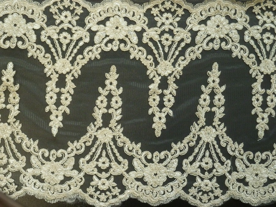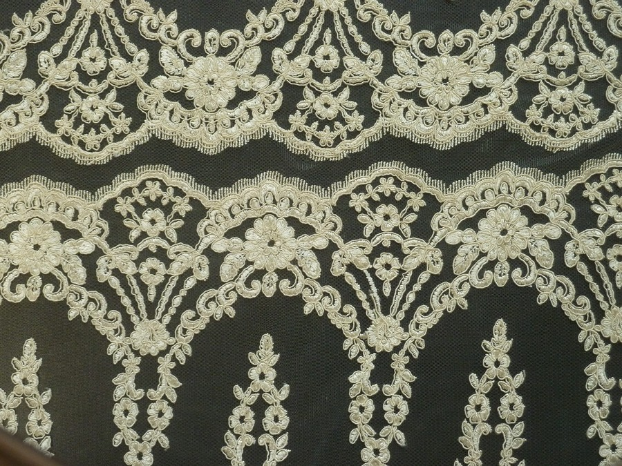 tato luxusní krajka krémová má oboustranné ozdobné zakončení. je vyšívaná na tylu. je nutné podšití materiálu. při využití bordury je nutné stříhat po šíři. je vhodná na svatební šaty, společenské šaty, sukně, halenky apod.