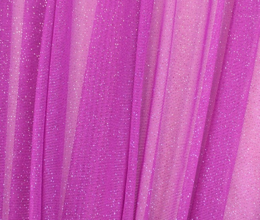 tento fuchsiový elastický tyl má vysoký obsah spandexu a lepené glittery. je splývavý. možno použít na společenské šaty, halenky, sukně, doplňky apod. je nutné podšití materiálu. tento materiál je také vhodný pro taneční skupiny na různé kostýmy.