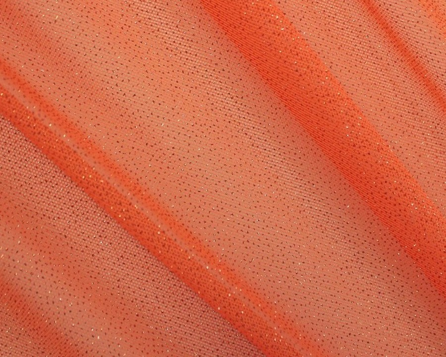 tento oranžový elastický tyl má vysoký obsah spandexu a lepené glittery. je splývavý. možno použít na společenské šaty, halenky, sukně, doplňky apod. je nutné podšití materiálu. tento materiál je také vhodný pro taneční skupiny na různé kostýmy.