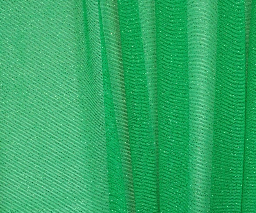tento zelený elastický tyl má vysoký obsah spandexu a lepené glittery. je splývavý. možno použít na společenské šaty, halenky, sukně, doplňky apod. je nutné podšití materiálu. tento materiál je také vhodný pro taneční skupiny na různé kostýmy.