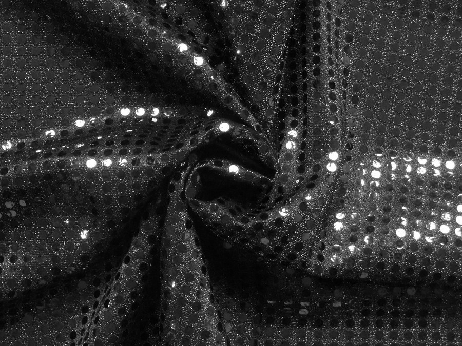Tato černá látka má flitry ve stejné barvě lepené na úpletu. Používá se ke společenským účelům na šaty, sukně, halenky, kostýmy apod.