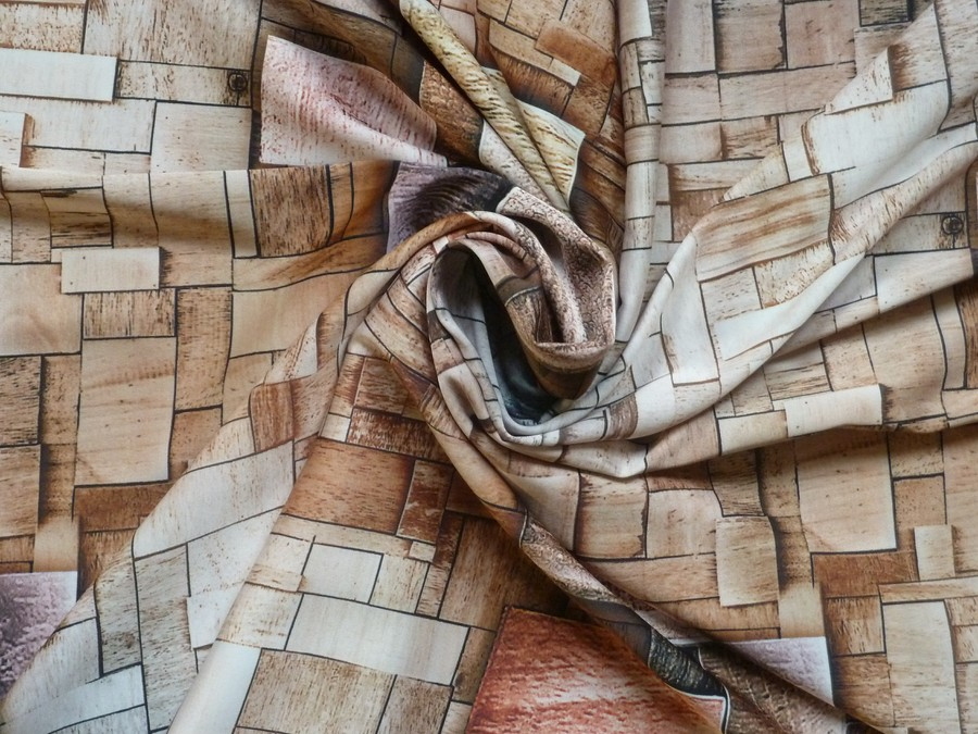 Tato exkluzivní tkanina v zemitých tónech v sobě spojuje hřejivý vzhled přírodních struktur s chladivým a noblesním dotekem hedvábí. Potisk věrně imituje texturu dřeva, letokruhů a patiny, což materiálu dodává neuvěřitelnou hloubku a architektonický rozměr.