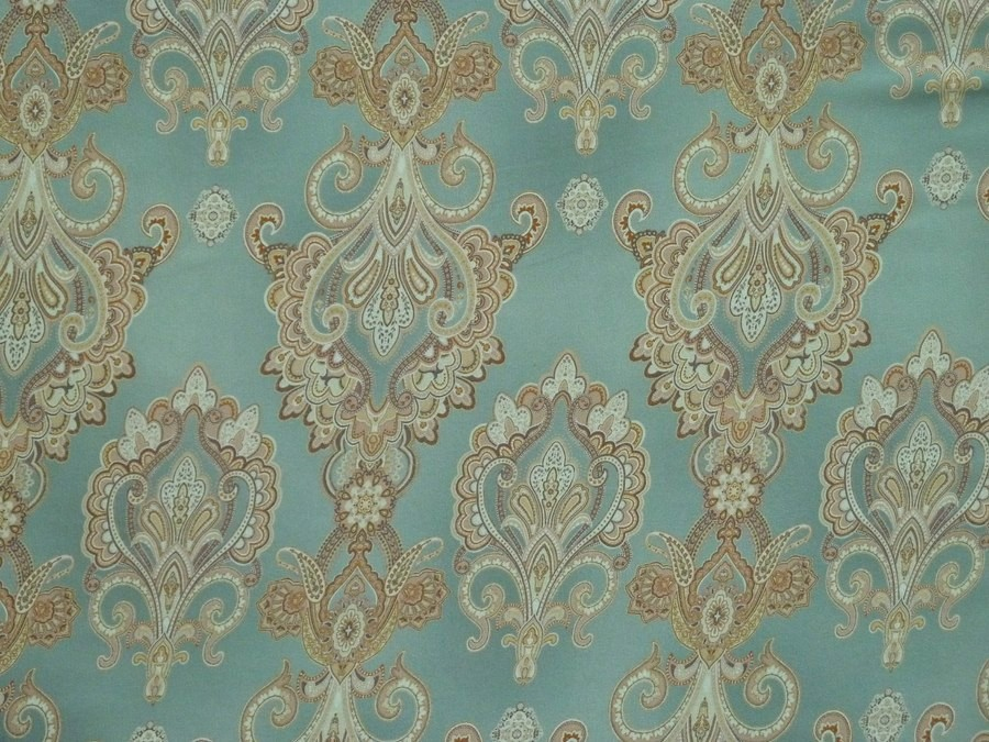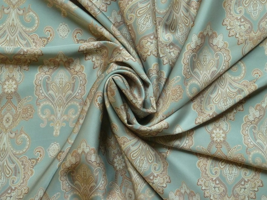 Luxusní acetátové hedvábí v jemném zeleném odstínu, zdobené precizním kašmírovým vzorem (paisley) a barokními medailony. Látka kombinuje historický nádech s moderní lehkostí materiálu. Možno použít na elegantní zavinovací šaty, halenky s vázankou u krku, stylová pyžama "loungewear" stylu, či dekorační polštářky nebo luxusní interiérové detaily.