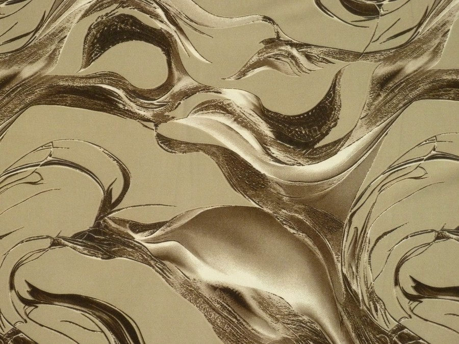 Toto acetátové hedvábí vás uchvátí svým dramatickým a moderním vzorem, který kombinuje dynamické tahy v odstínech zlata, stříbra a bronzu na béžovém podkladu. Materiál má nádherný hedvábný lesk, který dává vyniknout kovovým odleskům vzoru, a vyznačuje se špičkovou splývavostí. Díky svému výraznému vzoru tato látka nejlépe vynikne na večerních šatech, designových halenkách, nebo širokých kalhotách (palazzo), které vytvoří při chůzi úchvatný efekt tekutého kovu.