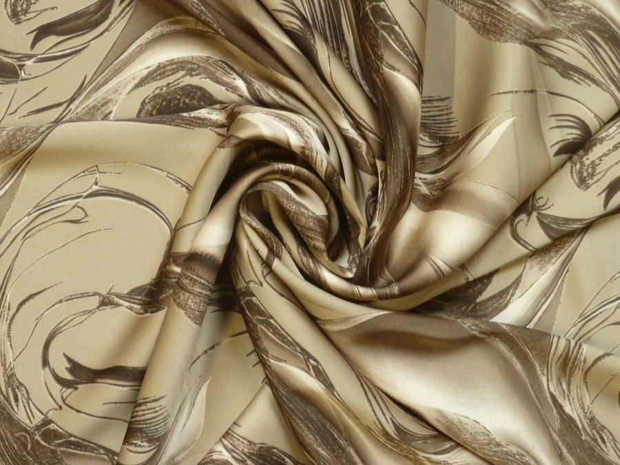 Toto acetátové hedvábí vás uchvátí svým dramatickým a moderním vzorem, který kombinuje dynamické tahy v odstínech zlata, stříbra a bronzu na béžovém podkladu. Materiál má nádherný hedvábný lesk, který dává vyniknout kovovým odleskům vzoru, a vyznačuje se špičkovou splývavostí. Díky svému výraznému vzoru tato látka nejlépe vynikne na večerních šatech, designových halenkách, nebo širokých kalhotách (palazzo), které vytvoří při chůzi úchvatný efekt tekutého kovu.