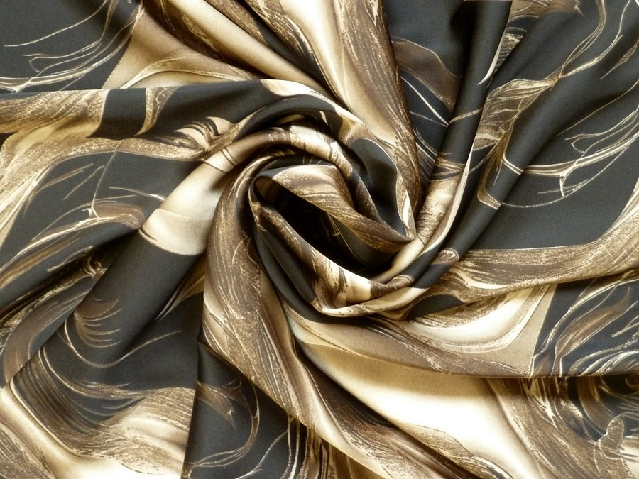 Toto acetátové hedvábí vás uchvátí svým dramatickým a moderním vzorem, který kombinuje dynamické tahy v odstínech zlata, stříbra a bronzu na hlubokém černém podkladu. Materiál má nádherný hedvábný lesk, který dává vyniknout kovovým odleskům vzoru, a vyznačuje se špičkovou splývavostí. Díky svému výraznému vzoru tato látka nejlépe vynikne na večerních šatech, designových halenkách, nebo širokých kalhotách (palazzo), které vytvoří při chůzi úchvatný efekt tekutého kovu.