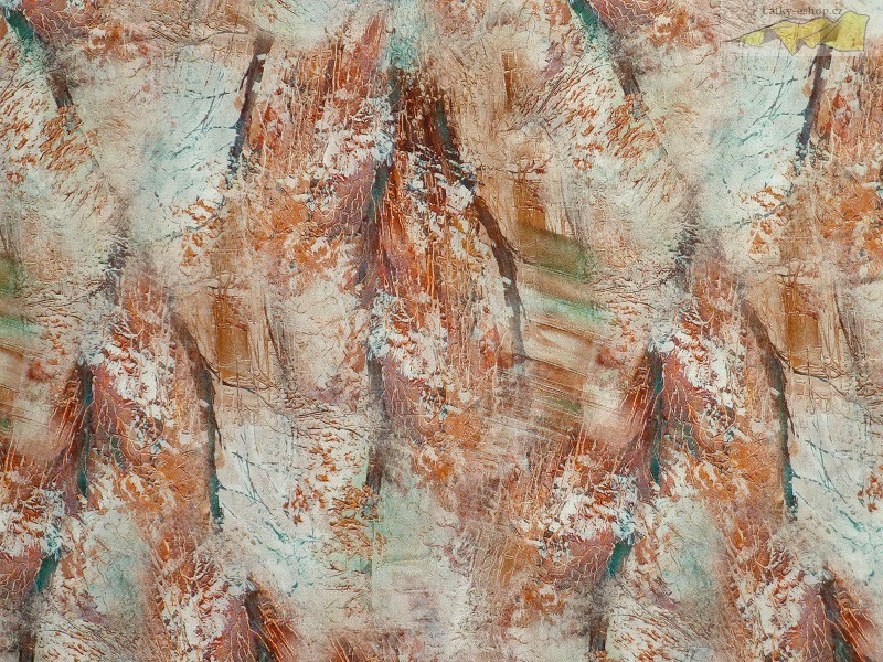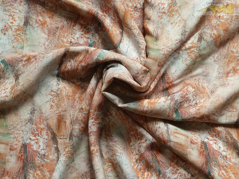 tato hedvábná šatovka má atraktivní vzor listové struktury. má velmi zajímavou kombinaci barev. je splývavá a příjemná na omak. možno použít na šaty, sukně, halenky, tuniky apod.