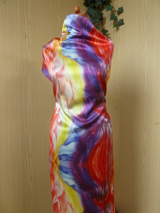Díky velkorysému a barevně bohatému vzoru je tato látka jako stvořená pro modely, které se vlní kolem těla: