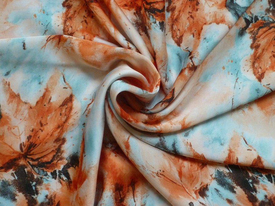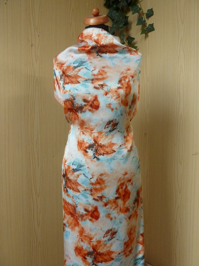 tato  hedvábná šatovka se vzorem oranžových listů má atraktivní kombinaci barev a velmi zajímavý vzor. je splývavá a příjemná na nošení. je vhodná na šaty, sukně, halenky, tuniky, košile, volné letní overaly apod.