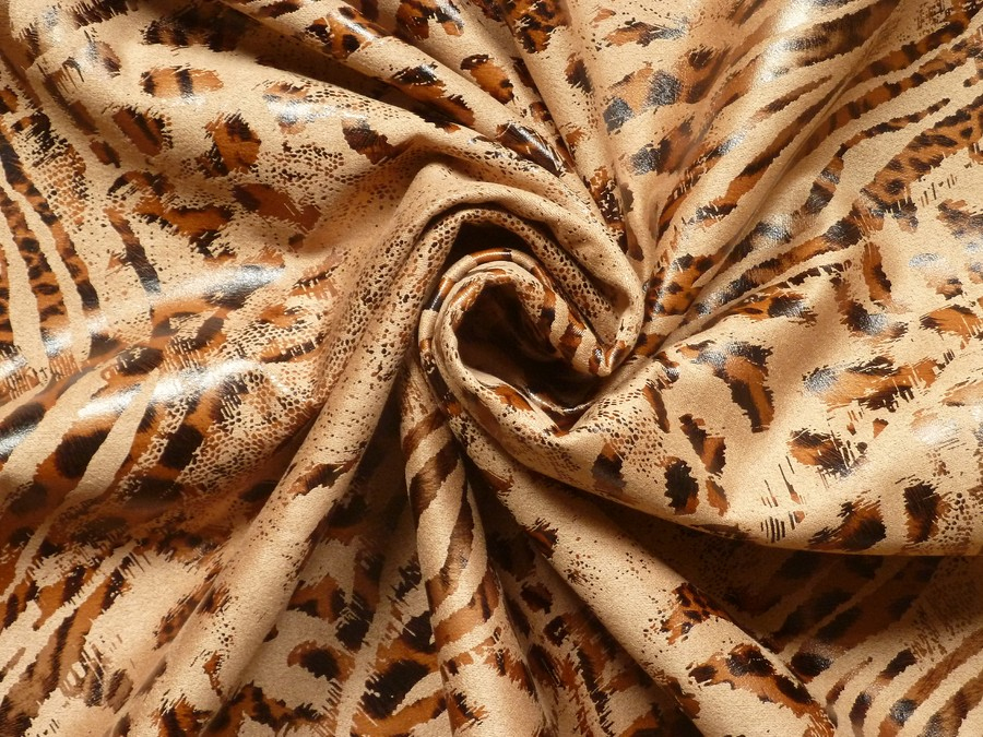 hnědý elastický semiš se zvířecím motivem, který v sobě snoubí eleganci a výjimečné pohodlí. Látka kombinuje různé zvířecí vzory v patchworkovém/kolážovém stylu. Kombinace těchto vzorů vytváří dramatický, bohatý a velmi módní vzhled. Tato látka je ideální pro extravagantnější a stylové oděvy, jako jsou bundičky, saka, sukně, úzké šaty, kalhoty nebo pro luxusní akcenty na oděvech. Vhodná i na doplňky (kabelky, obuv) nebo dekorační účely (polštáře).