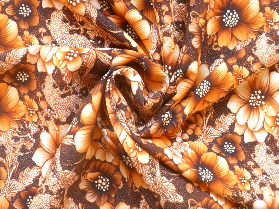 Tato karamelová viskózová šatovka s květy je lehoučká jako vánek, krásně splývá a na dotek působí až hedvábným dojmem. Ideální volba pro šaty, ve kterých se chcete cítit sebevědomě a neodolatelně. Možno použít i na halenky, sukně nebo široké kalhoty typu palazzo.