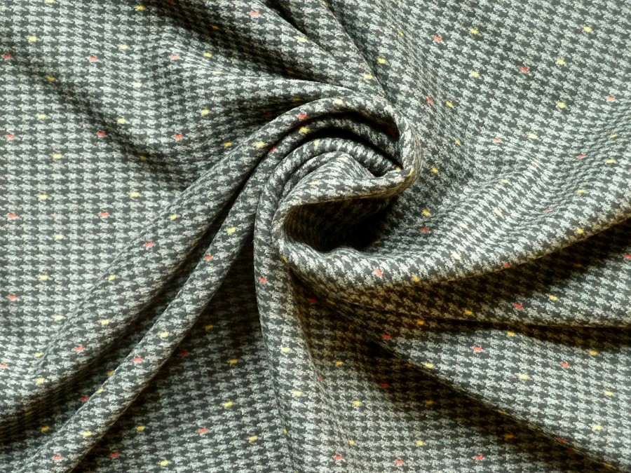 Tato látka s drobným vzorem kohoutí stopy je oživena diskrétními, náhodně rozmístěnými barevnými nopky. Příměs vlny dodává látce typický příjemný, hřejivý omak. Je ideální na šití elegantních sak, kostýmů, sukní, lehkých kabátků nebo vest, vhodných pro podzimní a zimní sezónu.