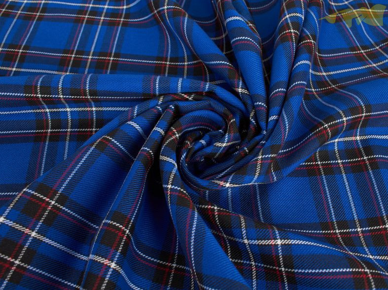 tato modrá kostkovaná látka se používá na výrobu svrchního oblečení. šijí se z ní saka, sukně, šaty, kostýmy, skládané sukně apod.