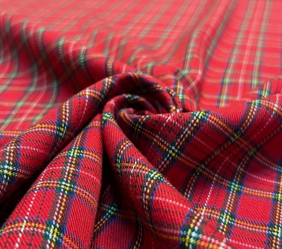 Tato kostýmovka má červený kostkovaný vzor. Má atraktivní kombinaci barev. Je splývavá a příjemná na nošení. Je vhodná na sukně, sáčka, kostýmy a šaty či jiné designové kousky.