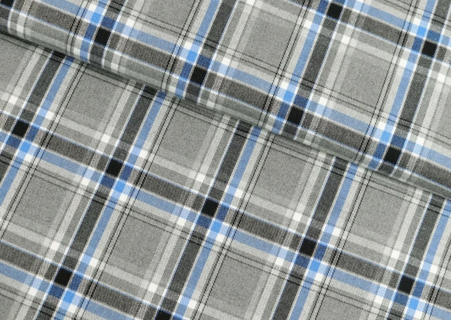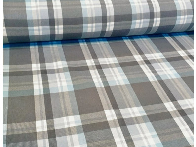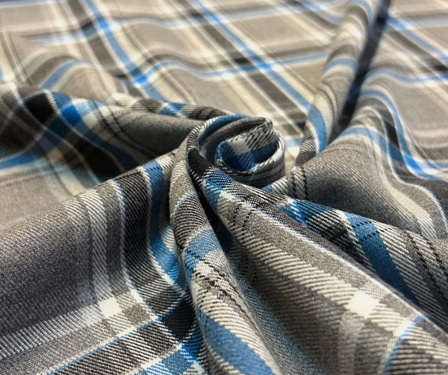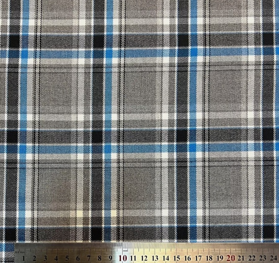 Tato kostýmovka má šedo modrý kostkovaný vzor. Má atraktivní kombinaci barev. Je splývavá a příjemná na nošení. Je vhodná na sukně, sáčka, kostýmy a šaty či jiné designové kousky.