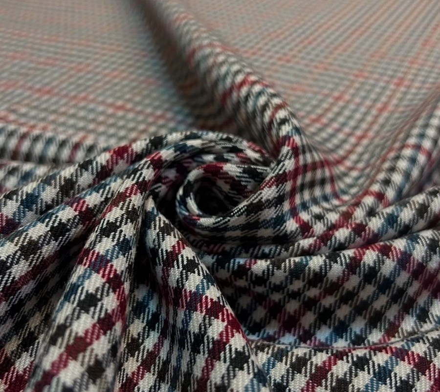 Tato kostýmovka má vzor drobných barevných kosteček. Má atraktivní kombinaci barev. Je splývavá a příjemná na nošení. Je vhodná na sukně, sáčka, kostýmy a šaty či jiné designové kousky.