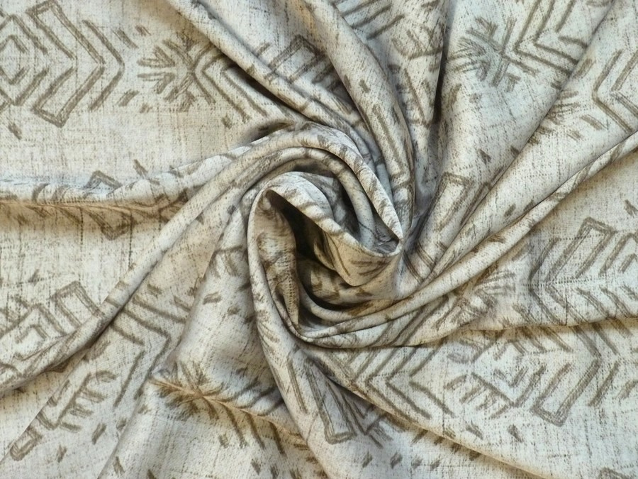 Toto acetátové hedvábí v barevné kombinaci přírodní krémové a tlumené hnědé (taupe) s výrazným geometrickým vzorem je snadno kombinovatelné a působí velmi luxusním dojmem. Je ideální volbou pro šití kousků, které vyčnívají z davu. Díky svému zajímavému vzoru a vlastnostem je vhodná pro šití stylových halenek, šatů, tunik, zavinovacích sukní nebo širokých letních kalhot.