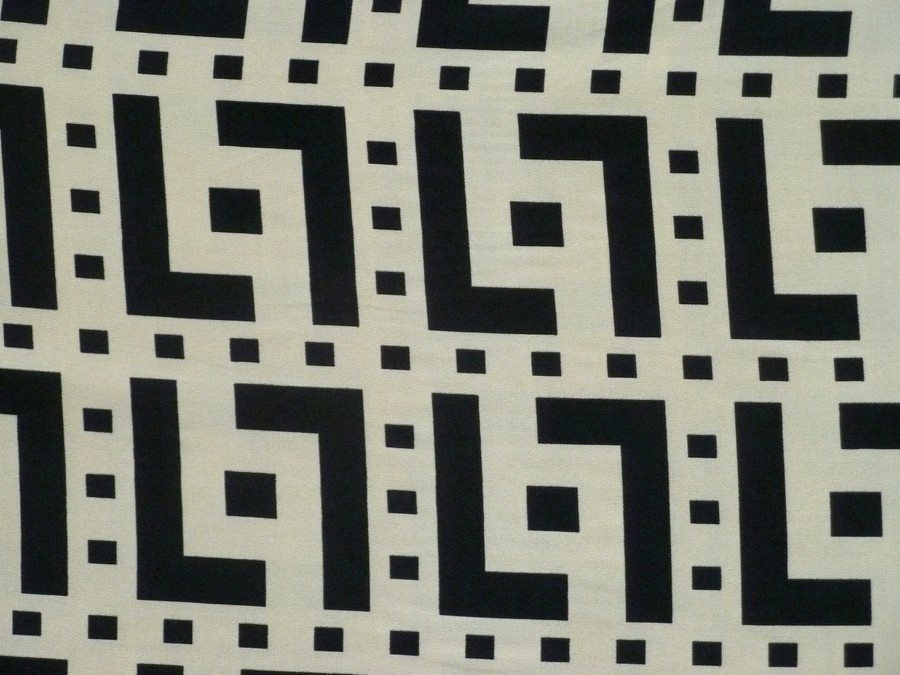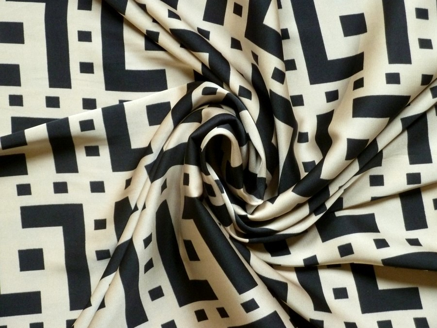 Tato exkluzivní tkanina z acetátového hedvábí zaujme na první pohled svým výrazným černo-krémovým kontrastem a pravidelným geometrickým rastrem. Možno použít na elegantní pouzdrové sukně, halenky s vazačkou, strukturovaná saka, nebo luxusní široké kalhoty (palazzo kalhoty) či košilové šaty.