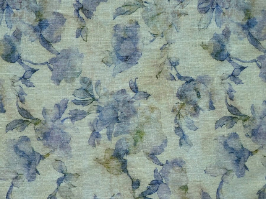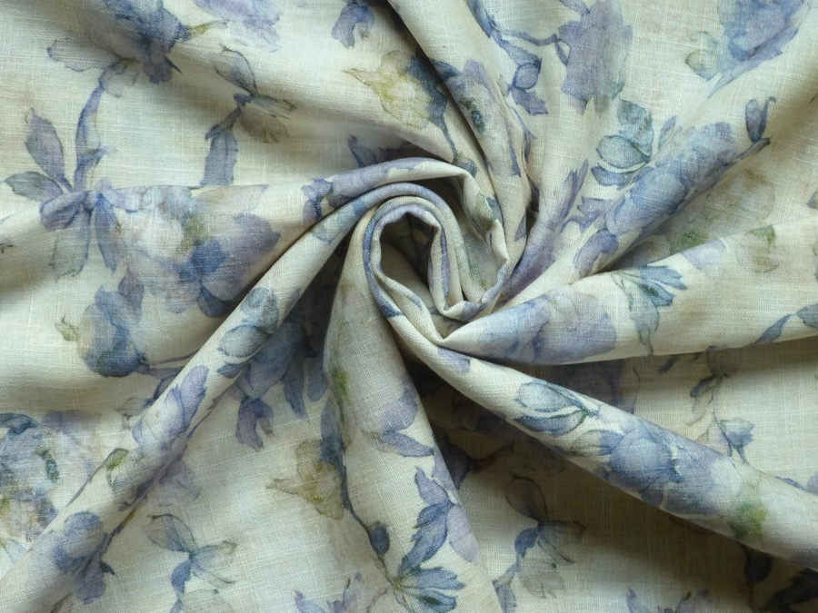 Tato lněná tkanina vyniká svou vzdušností a přirozenou elegancí. Dominantou je jemný potisk modrých květů v akvarelovém stylu na krémovém podkladu, který látce dodává vintage nádech a lehkost. Díky své splývavosti a střední gramáži je tato látka ideální pro letní šaty, vzdušné halenky, sukně nebo stylová pánská i dámská saka.