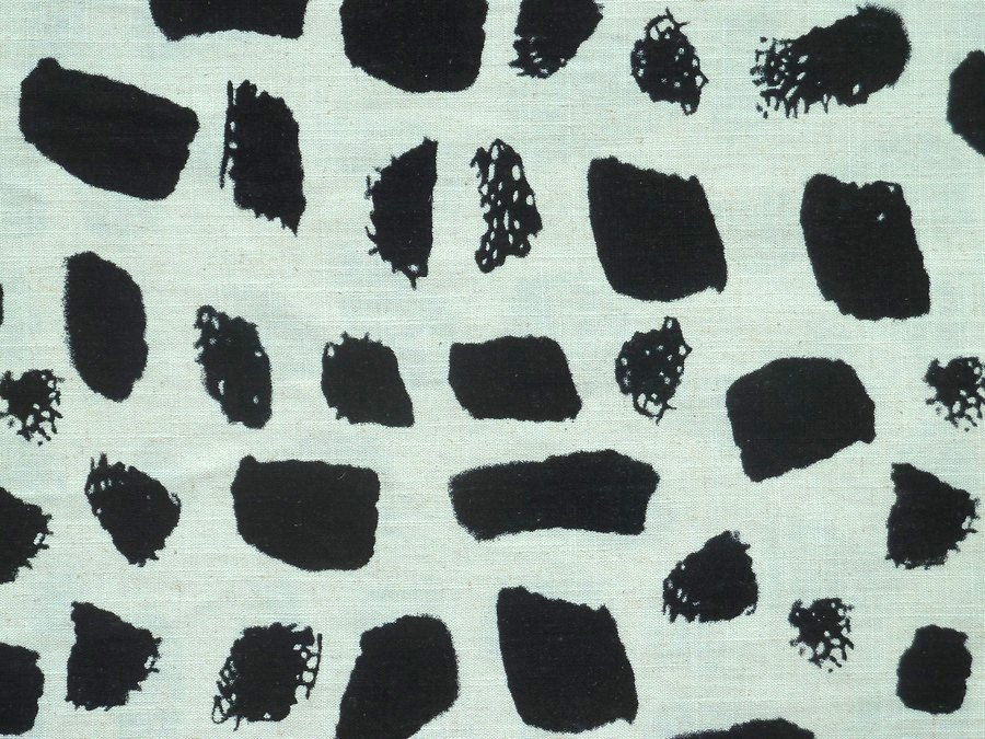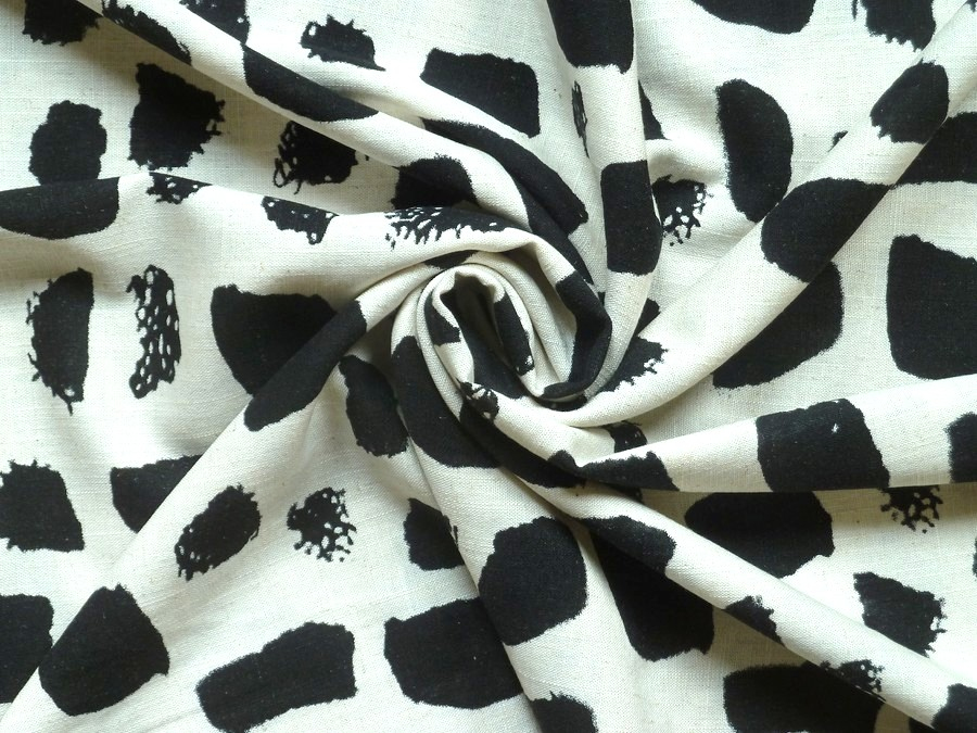 Tato lněná látka je ideální volbou pro ty, kteří hledají rovnováhu mezi surovou přírodou a moderním designem. Přírodně smetanový podklad s kontrastními černými skvrnami různých tvarů a textur. Některé „tahy“ jsou plné, jiné mají jemné mřížkování, což dodává vzoru hloubku. Možno použít na stylová lněná saka, oversized košile, designové sukně nebo šaty, které nepotřebují složitý střih – vzor mluví za vše.