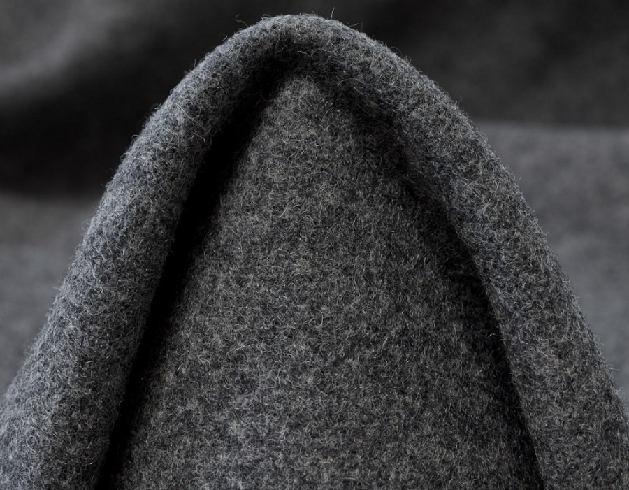 Loden v antracitové barvě. Loden je tradiční, hustě tkaná a plstěná vlněná látka, která je ceněná pro svou hřejivost, odolnost a přirozenou vodoodpudivost.