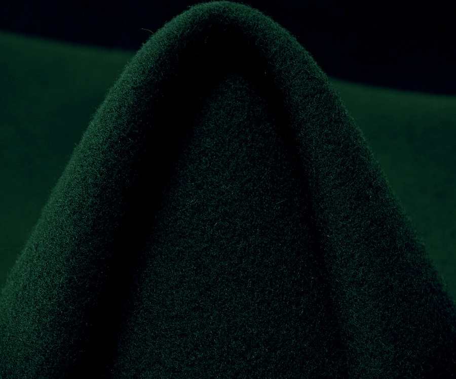Loden v lahvově zelené barvě. Loden je tradiční, hustě tkaná a plstěná vlněná látka, která je ceněná pro svou hřejivost, odolnost a přirozenou vodoodpudivost.