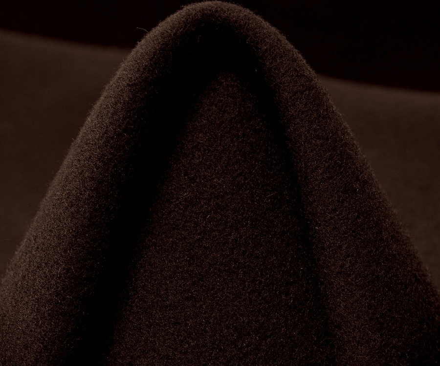 Loden v tmavě hnědé barvě. Loden je tradiční, hustě tkaná a plstěná vlněná látka, která je ceněná pro svou hřejivost, odolnost a přirozenou vodoodpudivost.