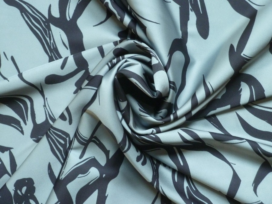 Toto mentolově modré (aqua) acetátového hedvábí tvoří osvěžující odstín, na kterém jsou vykresleny černé organické linie.