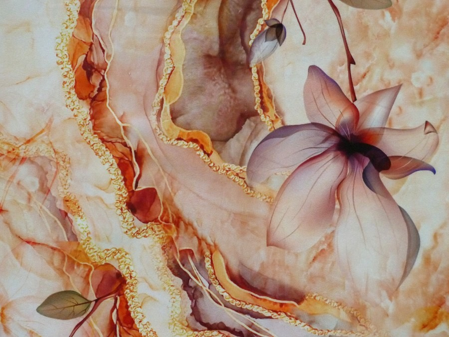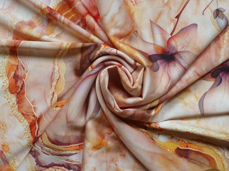 Tato šatovka je ztělesněním jemnosti a sofistikované elegance. Design kombinuje hřejivé zemité tóny s éterickým florálním prvkem, což vytváří dynamický, a přesto harmonický celek. Solitérní, poloprůsvitný květ v jemných fialových a levandulových tónech, který dodává látce hloubku a nádech tajemna. Je vhodná pro dlouhé splývavé společenské šaty (maxi dresses), luxusní zavinovací sukně, elegantní halenky nebo exkluzivní šátky.