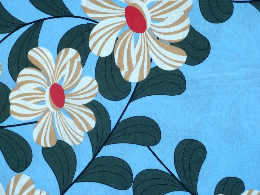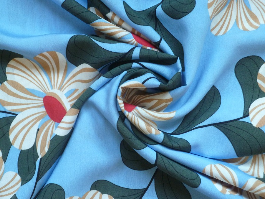 Lněná směs s viskózou: Retro květy na modré. Tato šatovka kombinuje přirozenou strukturu lnu s jemností a splývavostí viskózy. Výsledkem je materiál, který je prodyšný, příjemný na tělo a mnohem méně se mačká než čistý len.