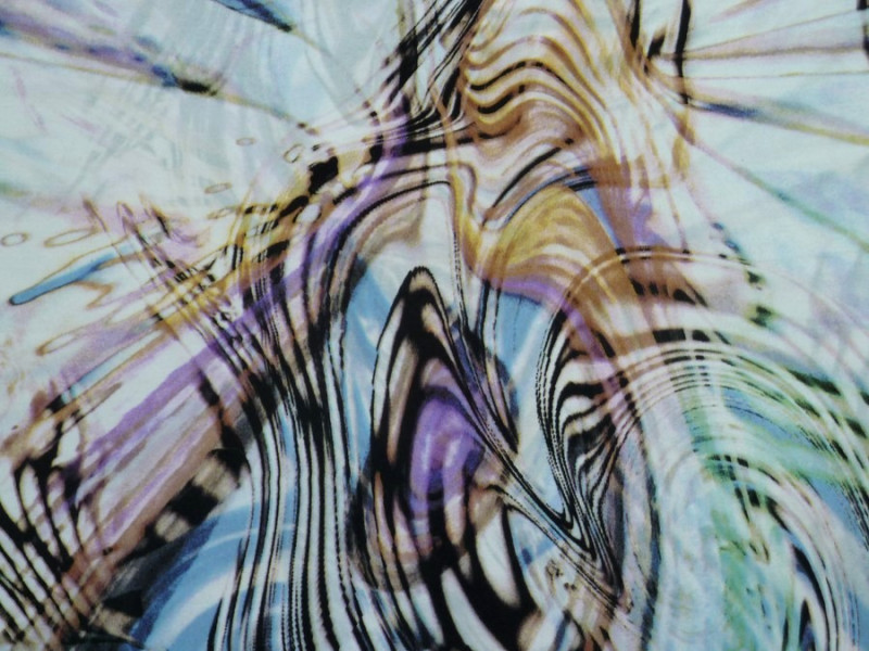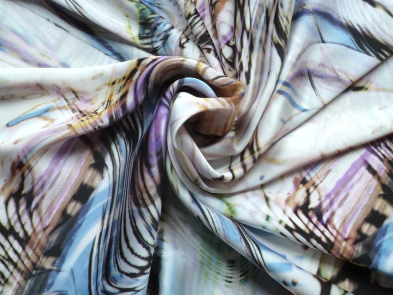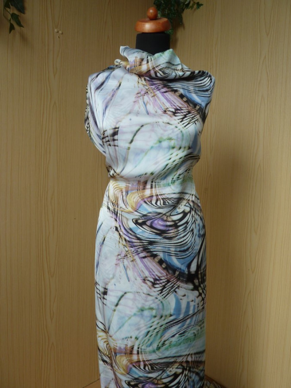 Toto acetátové hedvábí s abstraktním vzorem je splývavé a velmi příjemné na nošení. Má velmi zajímavý vzor, atraktivní kombinaci barev a snadnou údržbu. Je vhodné na šaty, sukně, halenky, košile, volné overaly, tuniky apod.