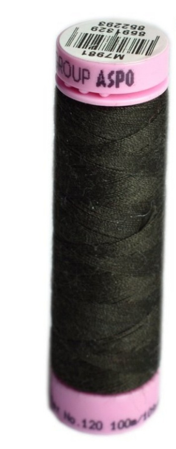 temně olivová univerzální šicí nit pro domácnost. Vhodná pro šití všech druhů textilních materiálů z vláken přírodních, směsových i plně syntetických.