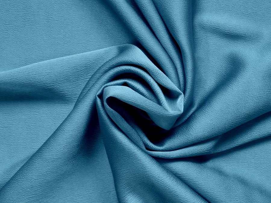 ocelově modrá krepová velmi měkká a oboustranná látka. Z jedné strany je lesklá a hladká, a z druhé strany je matná a krepatá. Zvláště vhodná pro výrobu elegantních halenek a šatů. Certifikát OEKO-TEX® STANDARD 100 = textilie jsou atestované a vhodné pro děti do 3 let.