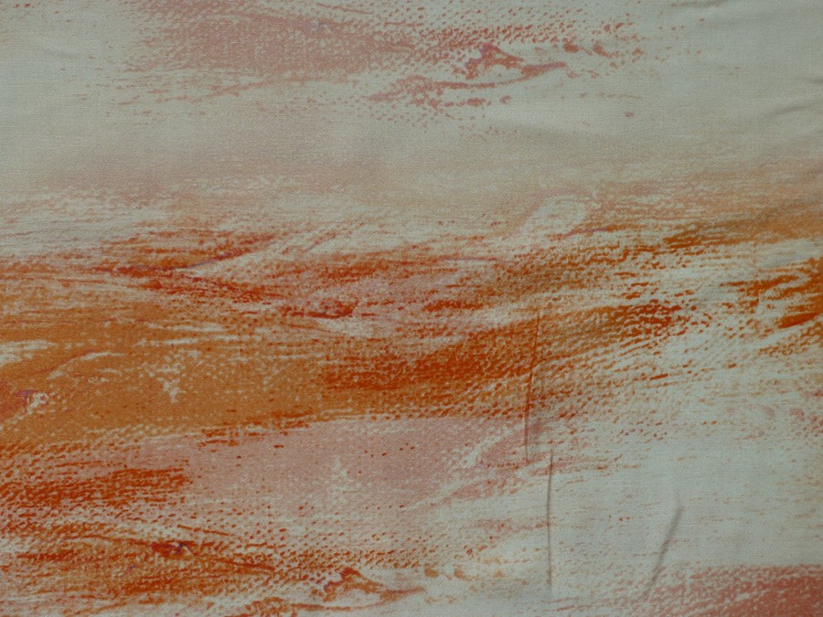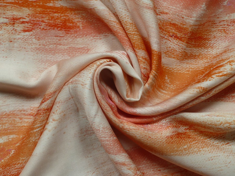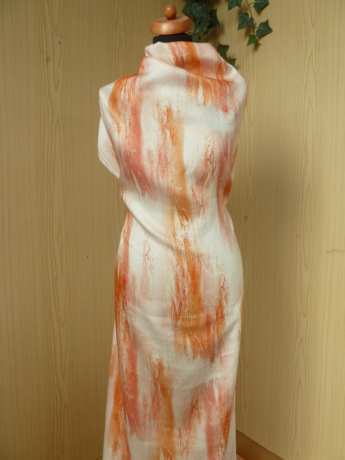 Tato elegantní šatovka kombinuje jemnost umělého hedvábí s prodyšností viskózy, což z ní dělá ideální materiál pro lehké a splývavé modely. Designu dominuje svěží, umělecký potisk v odstínech oranžové, který připomíná tahy štětcem na světlém podkladu. Díky svému vertikálnímu vzoru látka opticky prodlužuje postavu. Je perfektní volbou pro letní maxišaty, zavinovací šaty nebo lehké tuniky, elegantní halenky a topy, nebo kolové i úzké sukně, které vyžadují ladný pohyb materiálu.