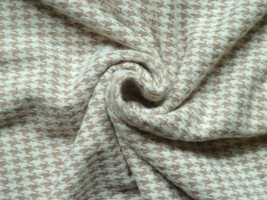 Tato pletenina je zdobena tradičním a nadčasovým béžovým vzorem kohoutí stopy. Vysoký podíl angory zajišťuje pletenině výjimečnou měkkost, hřejivost a mírně chmýřivý (chlupatý) povrch, který zvyšuje pocit luxusu a komfortu. Ideální pro šití zimních a podzimních pletených oděvů, jako jsou svetrové šaty, sukně, cardigany, vesty nebo přiléhavé roláky, kde je požadován tradiční vzor, vysoký tepelný komfort a pružnost.