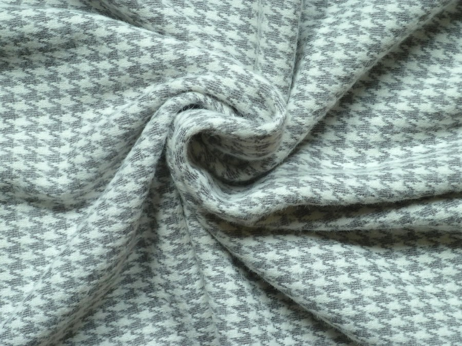 Tato pletenina je zdobena tradičním a nadčasovým šedým vzorem kohoutí stopy. Vysoký podíl angory zajišťuje pletenině výjimečnou měkkost, hřejivost a mírně chmýřivý (chlupatý) povrch, který zvyšuje pocit luxusu a komfortu. Ideální pro šití zimních a podzimních pletených oděvů, jako jsou svetrové šaty, sukně, cardigany, vesty nebo přiléhavé roláky, kde je požadován tradiční vzor, vysoký tepelný komfort a pružnost.